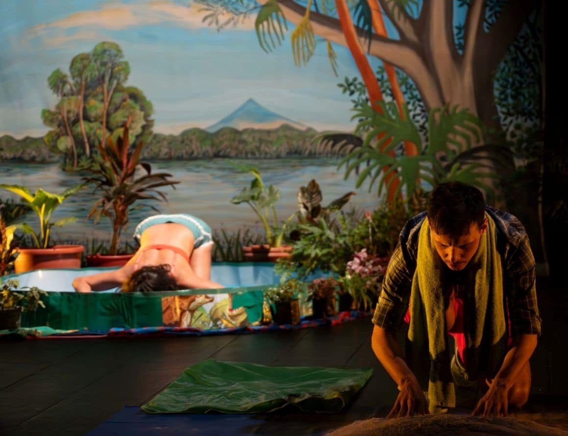 El primer movimiento de la obra corresponde al teatro documental. Pardo y Rodríguez despliegan elementos enmarcados por un fondo paradisíaco, la imagen de un paraje con un río manso, al fondo una montaña y el cielo con nubes que se difuminan en el azul. La iluminación es cálida. El actor vacía unos sacos y extiende su contenido al frente del escenario, algunos espectadores estornudan, es la tierra y el polvo que se levanta. Son gestos que transportan y avivan la geografía del lugar. Ambos cuentan su experiencia en Centroamérica –su desconocimiento de la región motivó este trabajo–, todo lo que viajaron, leyeron, escucharon y preguntaron.