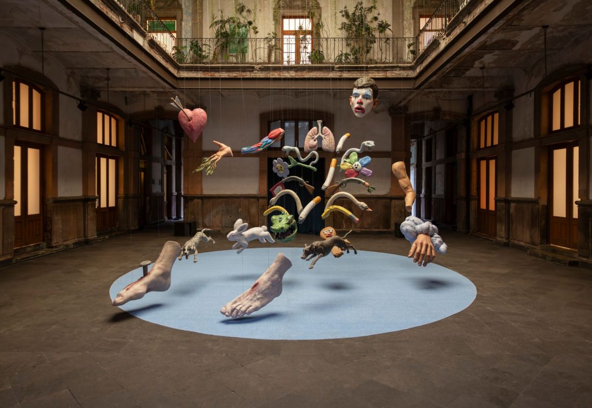 Justo así, en Salón Acme, el patio de Proyecto Público Prim lo ocupa una escultura móvil de Enrique López Llamas. Conjunto de veintiocho figuras, entre otras la cabeza de un payaso grifo, la florecilla de Vive sin drogas, una desfallecida galleta de jengibre, un corazón atravesado por una fecha y varios cigarrillos. Con los elementos necesarios para cautivar y fungir como escenografía –se decía en el público que es una especie de memorial de la cultura millennial–, I am the resurrection and I am the life (2026) arrasó en las historias de Instagram.