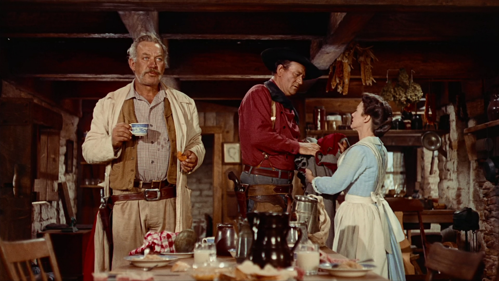 Les proyecto una escena de un clásico de John Ford que ya conocen, Centauros del desierto, con el propósito de leer a continuación ciertas líneas que Andrew Sarris le dedicó en 1976, y que son un bello ejemplo de apreciación del detalle y emoción estética por parte del crítico. La escena en cuestión es ese momento en que el personaje del juez de paz, predicador, alguacil y excapitán sudista encarnado por Ward Bond, asiste en el hogar de los Edwards a un intercambio de gestos silenciosos entre Martha (Dorothy Jordan), que es la señora de la casa, y el héroe forajido Ethan Edwards (John Wayne), que es su cuñado. Mientras saborea un café y una rosquilla del desayuno, el reverendo capitán advierte cómo Martha, creyéndose inadvertida, acaricia el gabán de Ethan antes de doblarlo. Cuando, en el siguiente plano, ella entrega la prenda y el sombrero a su dueño, ambos se miran, retenidos en una fugacísima pausa de comunicación silenciosa, que culmina con un eufemístico, metonímico beso de Ethan sobre la frente de Martha. El encuadre sitúa al capitán a un lado, al margen pero a la vez demasiado cerca de lo que vemos esbozarse como un idilio oculto, añejo y frustrado entre Martha y Ethan. No puede caber duda de que el reverendo capitán lo sabe; y es quizás toda esa comunidad del desierto la que, encarnada en su disimulo, mira hacia otro lado por cortesía y por el bien de todos.