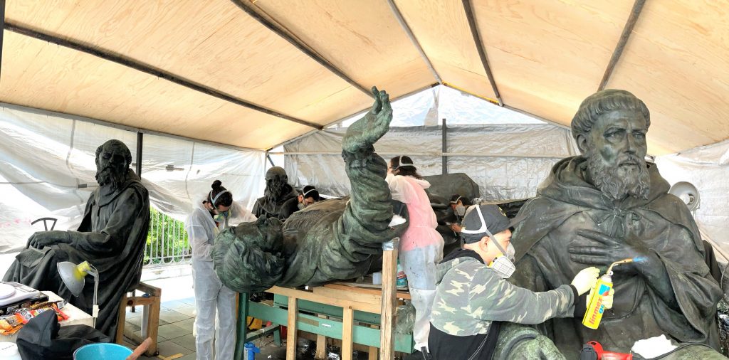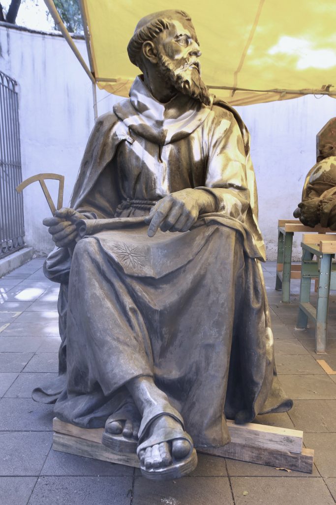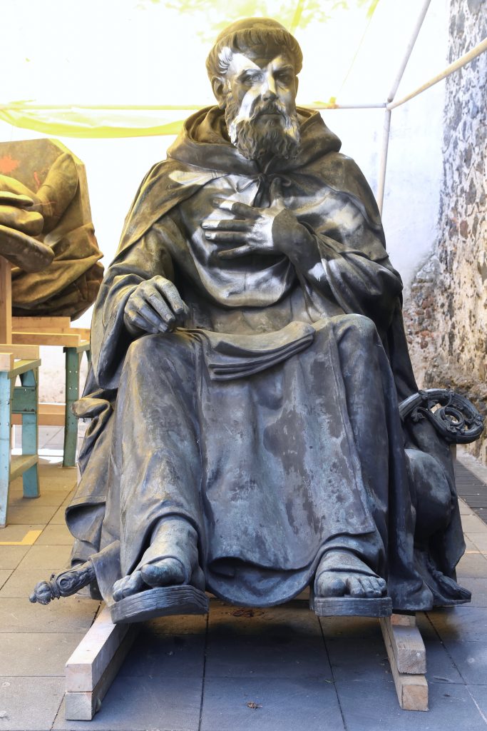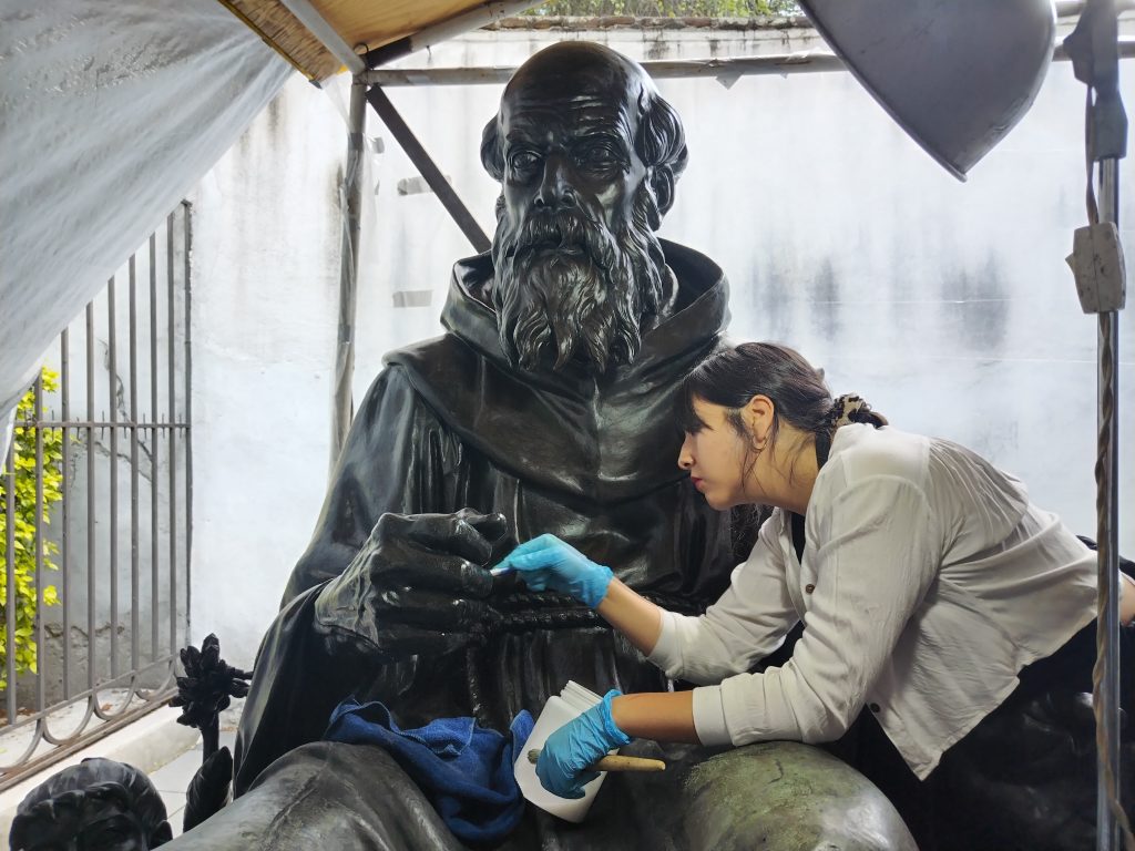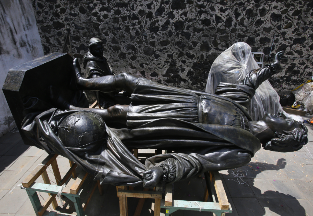 En la Coordinación Nacional. Para ello se habilitó un espacio especial y se fabricaron los soportes adecuados, dado los pesos de las esculturas. Inicialmente se tenía registrado que los frailes pesaban 850 kilos cada uno, mientras que Colón una tonelada 250 kilos, aproximadamente. Cuando se hizo el movimiento de las esculturas al Museo del Virreinato pudo precisarse, con base en las mediciones que nos permitió tomar la grúa que los trasladó, que cada uno de los frailes pesa 400 kilos, y Colón mil 400. La restauración se llevó a cabo entre octubre de 2020 y finales de 2023.