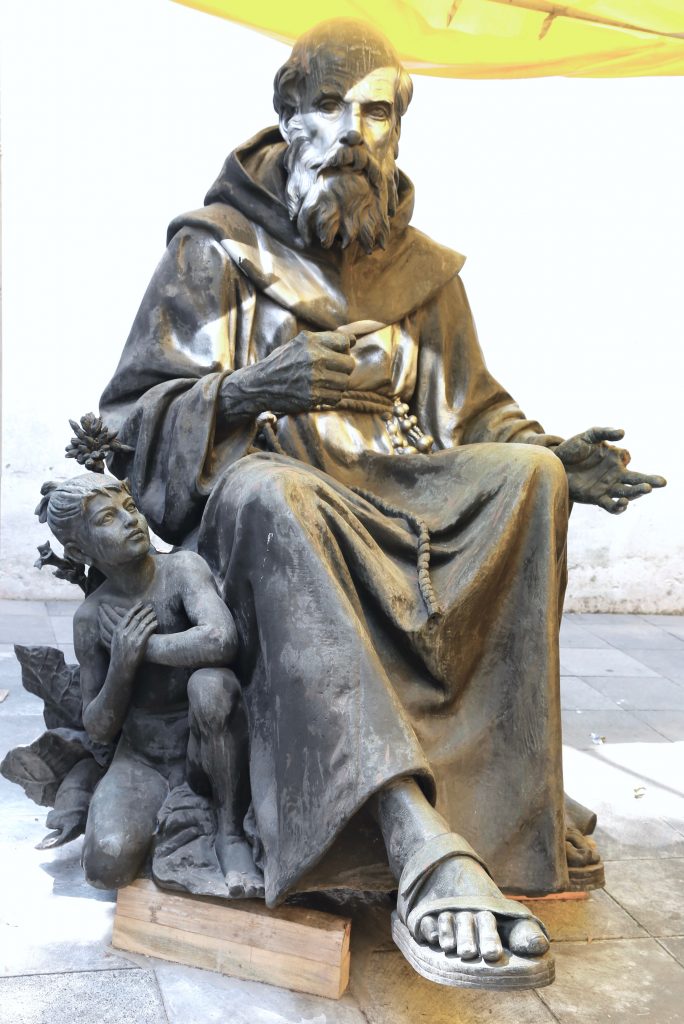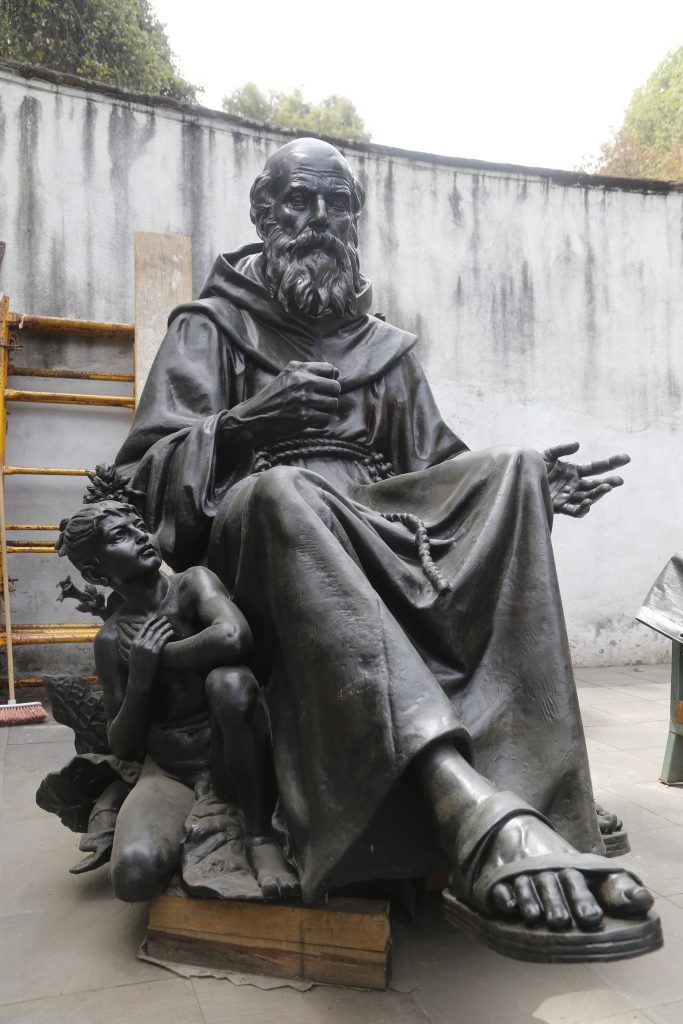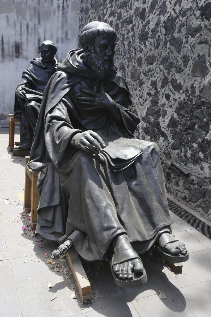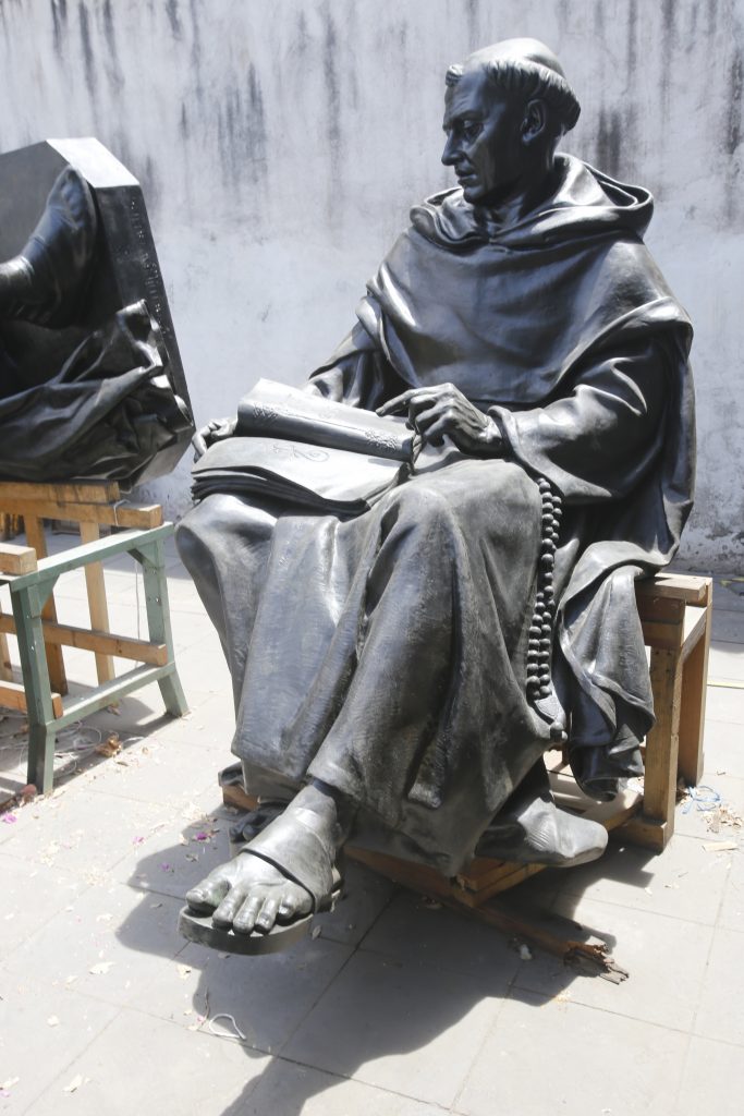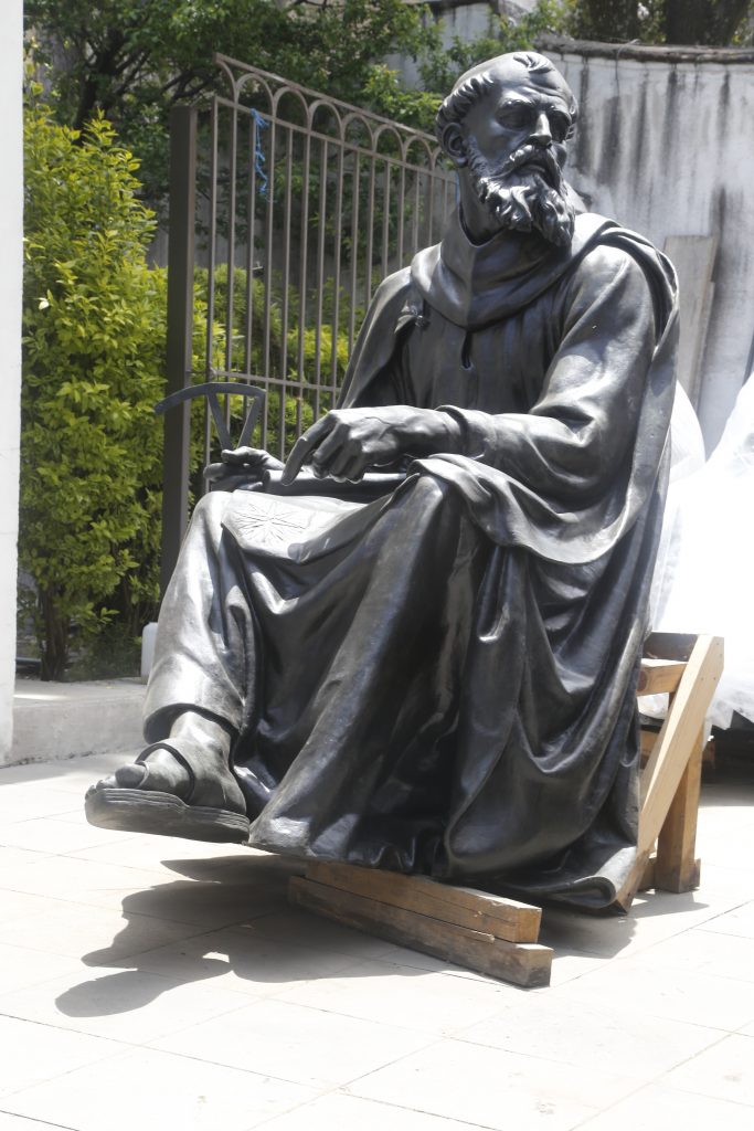En la Coordinación Nacional. Para ello se habilitó un espacio especial y se fabricaron los soportes adecuados, dado los pesos de las esculturas. Inicialmente se tenía registrado que los frailes pesaban 850 kilos cada uno, mientras que Colón una tonelada 250 kilos, aproximadamente. Cuando se hizo el movimiento de las esculturas al Museo del Virreinato pudo precisarse, con base en las mediciones que nos permitió tomar la grúa que los trasladó, que cada uno de los frailes pesa 400 kilos, y Colón mil 400. La restauración se llevó a cabo entre octubre de 2020 y finales de 2023.