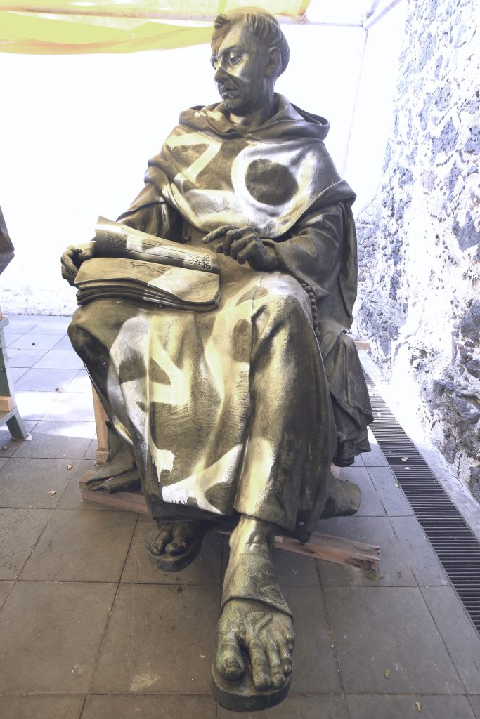 Posteriormente proseguimos con la limpieza de algunos productos de corrosión de hierro: aunque las esculturas son de bronce, algunos elementos que las sujetaban al pedestal habían dejado depósitos de ese material. También retiramos resanes previos que no eran del todo adecuados. Por ejemplo, había un balazo en la escultura de Fray Bartolomé de las Casas, por lo que quitamos ese resane y lo sustituimos por otro más apropiado. Este daño a la pieza probablemente esté asociado a las protestas sociales, pues desde la década de los 90 comienzan a intensificarse estas manifestaciones contra la llegada de Cristóbal Colón a América, y el monumento en Paseo de la Reforma es parte de este fenómeno, que no solo ocurría en México sino en todo el continente. De hecho, hay dos incidentes que podemos considerar los de mayor magnitud: los 12 de octubre de 1992 y de 1994. En la primera ocasión, amarran una de las esculturas a un camión e intentan derribarla; en la segunda los manifestantes llegan con pancartas, despliegan mantas, se suben a las esculturas, por lo que es posible que estos actos sean fuente de alguno de los daños que teníamos en las piezas. A la escultura de Fray Pedro de Gante no solo le faltaba un dedo, sino tenía también un golpe en la cabeza.