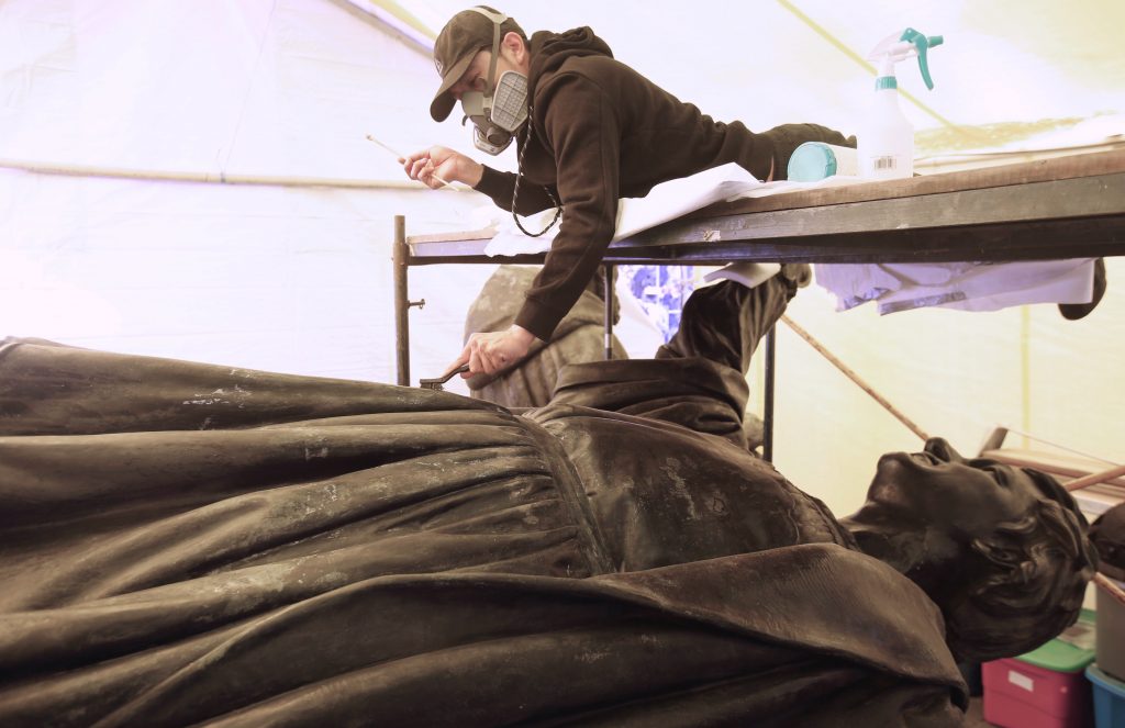 Luego de ocuparnos de los grafitis nos avocamos a la limpieza, por acción mecánica, del polvo y la suciedad, que realizamos con agua y detergentes especiales no iónicos en porcentajes muy bajos, aquellos que no favorecen la corrosión de los metales. Después hicimos un retiro de los recubrimientos que tenían las piezas y que habían sido aplicados durante intervenciones anteriores. Es habitual que las esculturas de bronce se recubran con algún tipo de material orgánico, específicamente ceras o incluso barnices, como parte de su protección. Al paso de los años ya estaban en muy malas condiciones. Esos recubrimientos constituían una capa gruesa en toda la superficie de las cinco esculturas de gran formato, cada una con formas complejas y numerosos pliegues y recovecos. Este fue el proceso más largo de toda la intervención. Si el total de la intervención tomó tres años, esa sola etapa requirió entre un año tres meses y un año y medio.