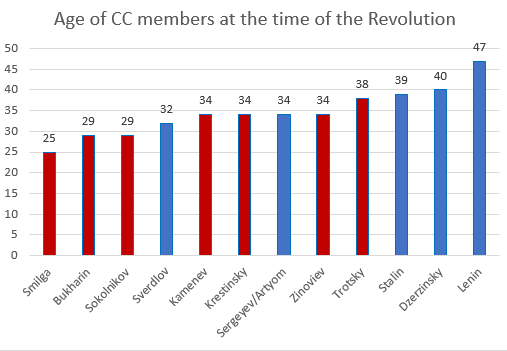 PS1. Hace algún tiempo elaboré este gráfico para ilustrar la relativa juventud de los miembros del Comité Central en el momento de la Revolución. La edad mediana era de 34 años. El miembro más joven tenía 25. Pero también mostré que más de la mitad de los miembros del Comité Central en 1917 (en rojo) fueron asesinados por Stalin. Otros murieron antes de que pudiera matarlos.