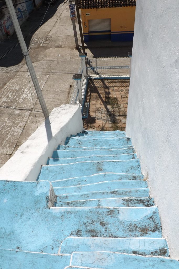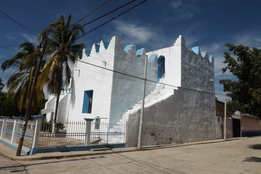 Las dimensiones del edificio primitivo se pueden calcular en algo más de 22 metros de frente, 11 de fondo y quizá unos 7 a 8 metros de altura. Para apreciar de un solo vistazo su singularidad, es necesario acercarse por la parte posterior, que permanece libre de añadidos. Ahí se distinguen claramente los tres volúmenes prismáticos que lo conforman: el central, más profundo y elevado, que alberga el presbiterio, y los laterales, al norte y al sur, que funcionan respectivamente como sacristía y bautisterio (fig. 10). Una pintoresca escalinata de peldaños desiguales, ubicada en el escote del bautisterio, permite acceder desde el exterior a la azotea (fig. 11). Allí se observan las mencionadas almenas escalonadas, un tipo muy poco común en la arquitectura novohispana (recuerdo ahora sólo las de Tepeaca), aunque frecuente en el arte hispanomusulmán.4 Los paramentos se encuentran completamente blanqueados, con algunas notas de color que han variado en cada repinte: en las fotografías que aquí muestro aparecen en azul; en otros momentos han sido terracota e incluso verdes. Desde este ángulo, y entre las palmeras que adornan el atrio, el conjunto parece arrancado del Magreb: un morabito norafricano misteriosamente trasplantado a las sierras guerrerenses.