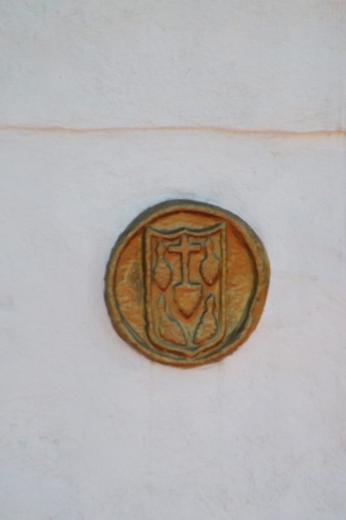 En la albanega o enjuta de este alfiz se encuentran cuatro escudos tallados en piedra, hoy lamentablemente cubiertos con pintura dorada de esmalte (fig. 14). El primero, de norte a sur, podría ser un emblema agustino: un corazón flechado rodeado por una guirnalda (fig. 15). Sin embargo, el desgaste impide una lectura cabal. El segundo, mejor conservado, corresponde claramente al emblema franciscano de las cinco llagas de Cristo (fig. 16).5 El tercero es ya ilegible por el deterioro, y el cuarto muestra una simple cruz, de ejecución más tosca. Por simetría, cabría esperar un quinto escudo, que no existe. Esta ausencia llama la atención sobre un detalle revelador: todo ese ángulo de la fachada de la antigua capilla abierta parece haber sufrido algún daño, y posiblemente se reconstruyó sin demasiado cuidado. No sólo falta el escudo correspondiente, sino que el alfiz se interrumpe abruptamente y sobre el pretil faltan tres almenas.