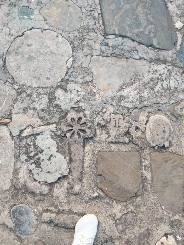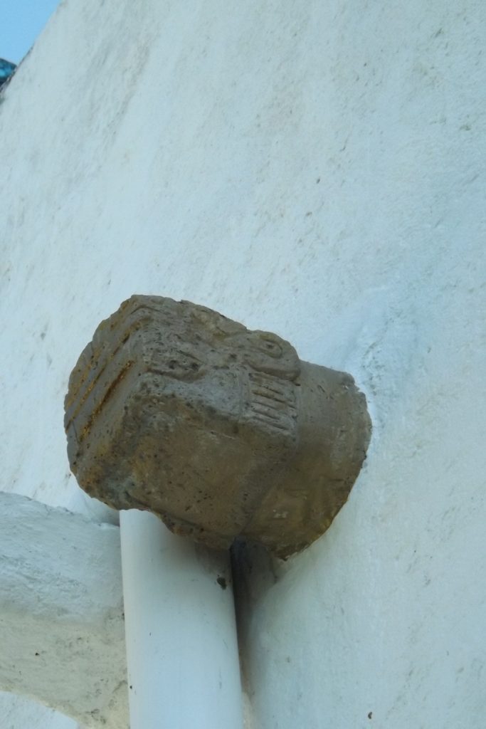El recinto religioso, incluidos sus anexos y el atrio, ocupa una manzana completa de aproximadamente 75 por 50 metros, con los lados mayores al norte y sur. Sorprende, apenas se pisan las lajas del patio, descubrir que muchas de ellas son lápidas arqueológicas (fig. 3). Al igual que otros restos dispuestos sin orden aquí y allá (entre ellos, una curiosa escalera monolítica, fig. 4) se trata de piezas traídas en la década de 1980 desde el cercano ejido de Totolapa, un sitio mesoamericano de importancia en el periodo Clásico, aunque ya muy saqueado.3 Sin embargo, hay otras piezas antiguas, incrustadas en los muros, que no parecen compartir el mismo origen. Al menos, no fueron incluidas en los estudios que documentan la procedencia del resto, y podrían haberse colocado en su sitio desde la construcción del edificio colonial. Sobresalen especialmente unas cabezas de serpiente emplumada, de rasgos casi abstractos, que asoman en lo alto del templo católico como si fueran gárgolas (fig. 5).