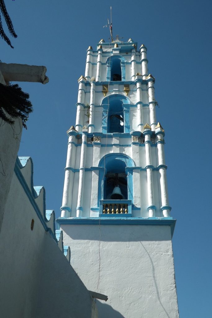 La iglesia tiene su fachada dirigida hacia el poniente y aparece ligeramente descentrada con respecto al atrio, lo que sugiere que originalmente contó con algunos anexos al norte, donde hoy se levantan construcciones aparentemente modernas. A primera vista se advierte su origen colonial, similar a otras iglesias de la región, aunque con claras modificaciones posteriores. Tiene una sola nave cubierta con bóveda de cañón y una fachada transformada con pretendido clasicismo, quizá resultado de una intervención reciente (fig. 6). Destaca, sobre todo, su gran torre con campanario de tres cuerpos, cuyas columnas adosadas, rematadas en pináculos, le dan profundidad y personalidad a pesar de su natural sencillez (fig. 7). Todo el conjunto se encuentra estucado y pintado, desafortunadamente con pinturas vinílicas y de aceite, que incluso marcan los detalles en falso dorado. Sólo algunas piedras rudamente labradas asoman en la portada principal y en la lateral, situada al norte. El pretil de los muros de la nave presenta en lo alto un perfil mixtilíneo, seguramente de época barroca (fig. 8).