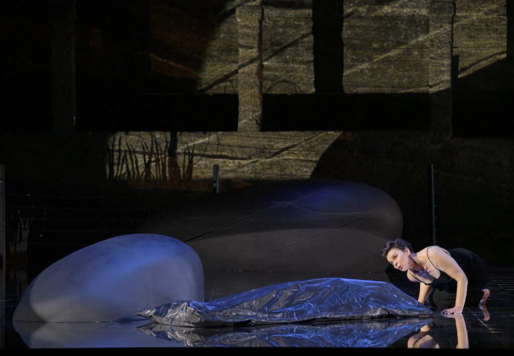 Peter Sellars percibió una afinidad entre Erwartung y “Der Abschied” y las unió en una puesta ascética, casi como si hubiera decidido hacer lo mínimo indispensable para que estas obras pudieran presentarse juntas en una versión escénica. Esa economía de medios acentúa la fuerza de cada elemento. El bosque se convierte en la proyección espacial de la psicología de la protagonista, un recinto de pura ansiedad delimitado por alambres de púas. Mientras que en el libreto de Erwartung, la mujer busca desesperadamente el cuerpo de su amante en la oscuridad del bosque, aquí lo recibe desde el comienzo, dentro de una bolsa para cadáveres entregada por hombres armados. Esta es posiblemente la intervención más fuerte de Sellars, junto a algo que conocemos por las notas de programa: la mujer está embarazada de un hijo que no conocerá a su padre (es un poco frustrante que el programa de mano deba suplir algo que de ningún modo está en escena, como si la idea de pasticcio incluyera también el papel que uno tiene entre las manos pero que podría no haber comprado).