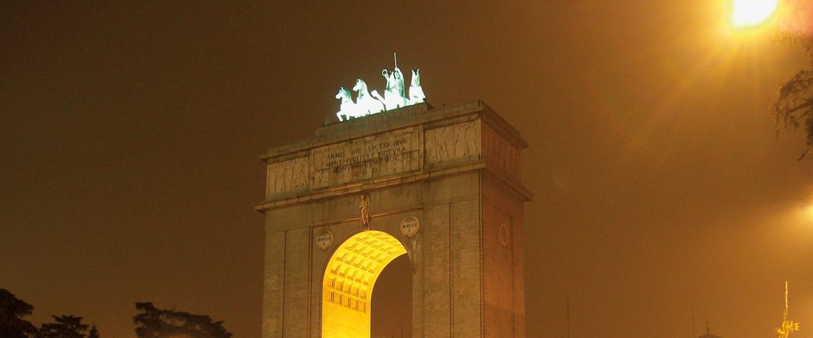 Con este pensamiento, el Forastero no tiene dificultad en conciliar el sueño, no sin antes prometerse regresar al monumento a primera hora de la mañana siguiente. Pues, en sus prisas, habría olvidado contemplarlo desde su cara interior, siendo así que lo normal sería que, por ese otro lado, se contuviera una inscripción de similar carácter. La visita mañanera no le defrauda. La inscripción, que en efecto existe, es anuncio del soberbio campus universitario madrileño que a continuación del arco de triunfo se extiende: aedes studiorum matritensis. Con lo que comprueba que, de este lado, el arco adquiere un sentido completamente diferente, funcionando ahora no como arco de triunfo, sino como monumental puerta de acceso a la primera universidad del país, la llamada Ciudad Universitaria, hoy campus de la Universidad Complutense de Madrid. Esta universidad, se dice poéticamente, florece ante los ojos del dios: florescit in conspectu dei. El Forastero, que ha hecho estudios universitarios, identifica aquí un guiño a las palabras finales del Gaudeamus. No obstante, le choca el genitivo masculino, pues, como ha podido saber, quien desde lo alto de su cuadriga contempla el campus no es dios alguno, sino Minerva. Pero, constándole ya la confesionalidad imperante en la época, enseguida se corrige: la Complutense, con independencia de quien sobre el arco campea, florece ante la exclusiva mirada de Dios, con mayúscula.