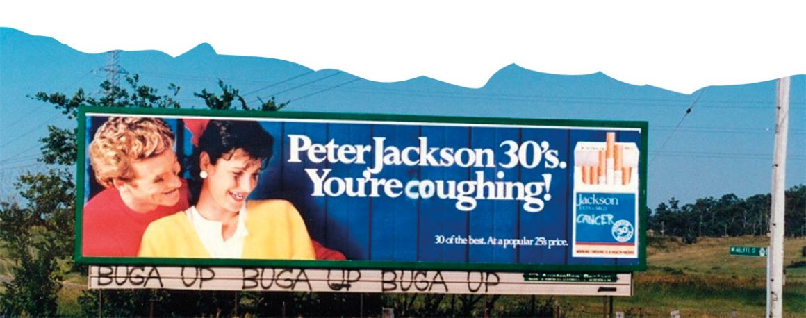 Estamos en Australia, cerca de 1980, y el acusado era una de las muchas personas que alteraban vallas publicitarias de tabaco, alcohol y refrescos bajo el nombre colectivo de buga up. La idea era sencilla: desmontar la asociación entre productos y emociones positivas que hace la publicidad y hacer explícitos los efectos perniciosos de esos productos en la misma jugada. Todo ello con humor, y en el propio espacio donde ocurre, en un ejemplo excelente de arte colectivo que sintetiza todos los puntos tratados hasta ahora. Destacaré la tercera fase del hecho artístico: en 1994 Australia fue el primer país en prohibir la publicidad de tabaco en exteriores.