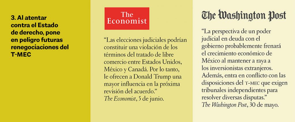 En contraste con la percepción del primer año de gobierno en el que Claudia Sheinbaum gozaba de una aprobación exterior debida a sus aparentes victorias en la disputa diplomática y de política comercial con Trump, la captura del poder judicial ha tenido un efecto negativo en la opinión internacional. Uno de los primeros en llamar la atención fue The Economist, quien el 15 de mayo cabeceó su nota de manera elocuente: “México será el único país que elija a todos sus jueces. El último control significativo sobre Morena, el poderoso partido gobernante, se desvanecerá”. A este le siguió un videopost del 2 de junio en X de Fareed Zakaria, reproducido inmediatamente en CNN y, en seguida, por múltiples medios internacionales y nacionales. Zakaria reconoce que “Sheinbaum cuenta con uno de los índices de aprobación más altos que cualquier otro líder mundial en funciones. Ha conquistado elogios dentro y fuera por su desafío a las amenazas arancelarias del presidente Trump. Aunque detrás de su imagen pragmática se esconde una agenda interna mucho más disruptiva, la que podría socavar radicalmente el Estado de derecho en México”.