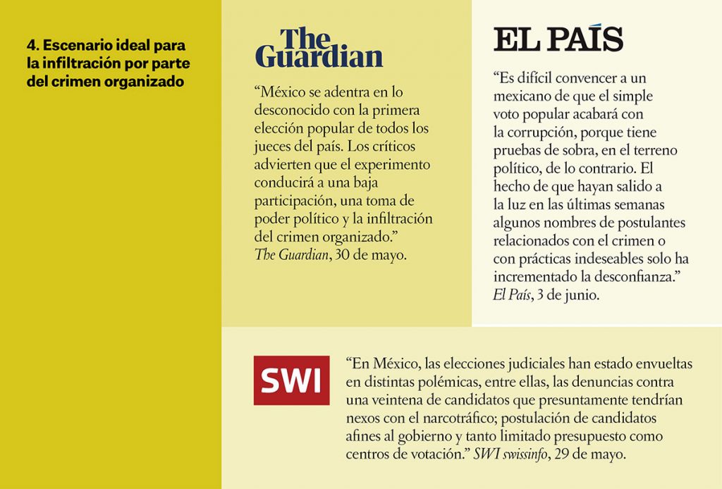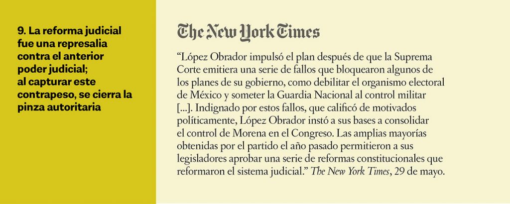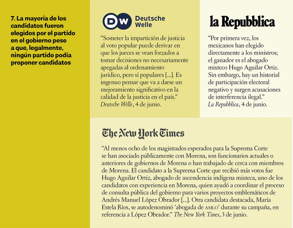No está de más señalar que una misión de observación de la Organización de los Estados Americanos desaconsejó replicar esos comicios, según un informe preliminar difundido el 6 de junio pasado. La misión, integrada por dieciséis comisionados de una decena de países miembros de la oea, manifestó preocupación por el bajo nivel de participación ciudadana e instó a la ciudadanía y las instituciones mexicanas “a evaluar si el modelo actual de selección de autoridades judiciales a través del voto popular, que no tiene precedentes a nivel mundial, contribuye a fortalecer los principios fundamentales de la administración de justicia; o si, por el contrario, acaba debilitando la transparencia, imparcialidad, eficacia e independencia del poder judicial. […] Dicho lo anterior, la misión no recomienda que este modelo de selección de jueces se replique para otros países de la región (Elección del poder judicial en México 2025. Informe preliminar. Misión de Observación Electoral de la oea).