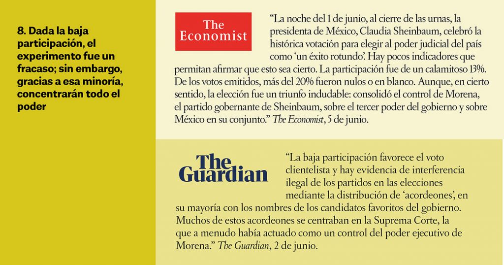 Según J. P. Spinetto de Bloomberg, el aspecto más inquietante de estas elecciones judiciales es que constituyeron una toma de poder disfrazada de ejercicio democrático. Las elecciones tenían la intención de legitimar un proceso cuyos resultados se conocían de antemano, incluso la baja participación ciudadana. Habrían presumido lo mismo incluso con el 1% de participación. Y así lo ha confirmado Claudia Sheinbaum la noche misma de la elección: “ahora somos el país más democrático del mundo”. El oficialismo se asegura así el control de los tres poderes del Estado mexicano. Asimismo, mantiene su dominio sobre unas fuerzas armadas encargadas de gestionar puertos, aeropuertos y aduanas, además de la construcción de las obras públicas más importantes. Con ello Morena emerge como uno de los fenómenos políticos con mayor concentración de poder entre las democracias del mundo. Finalmente y como nos recuerda Emiliano Polo de Foreign Policy: “esta reforma no estaba diseñada para empoderar a los ciudadanos”.