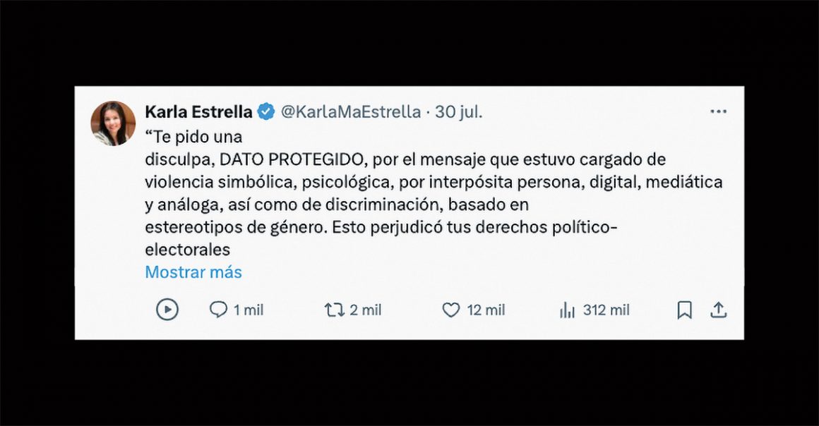 Algunos días después, el 18 de junio, el Tribunal Electoral del Poder Judicial de la Federación sancionó a Karla María Estrella, ama de casa en Hermosillo, Sonora, por haber publicado un tuit en el que señalaba lo que consideraba nepotismo político. Lejos de tratarse de una opinión más en la red social, el tribunal la obligó a pagar una multa, tomar un curso obligatorio y escribir durante un mes disculpas públicas con un texto dictado con precisas fórmulas legales.