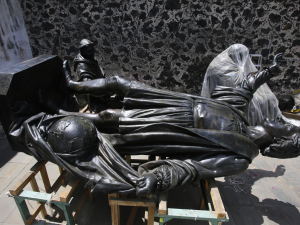 Las esculturas restauradas de Colón y los frailes aguardan su destino